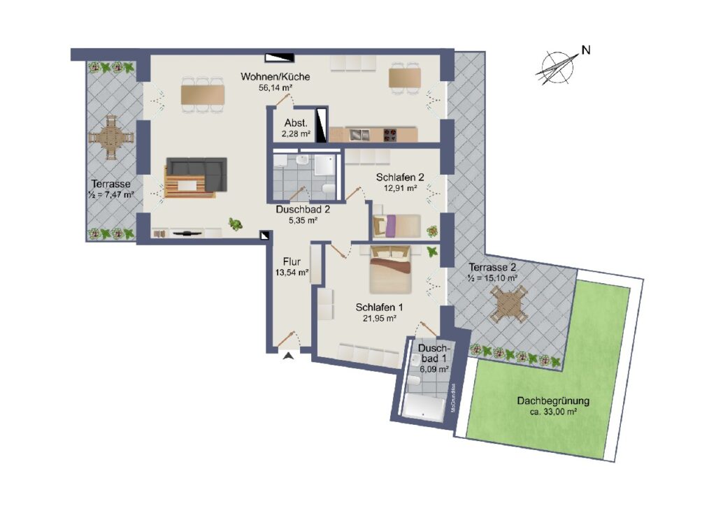 Die Wohnung verfügt über zwei komfortable Schlafzimmer, die jeweils mit einem eigenen Bad en Suite ausgestattet sind und somit ein Höchstmaß an Privatsphäre und Wohnqualität bieten. Ergänzt wird das Raumangebot durch eine moderne Küche, ein weiteres Gäste-WC bzw. Bad sowie einen praktischen Abstellraum mit Waschmaschinenanschluss.
