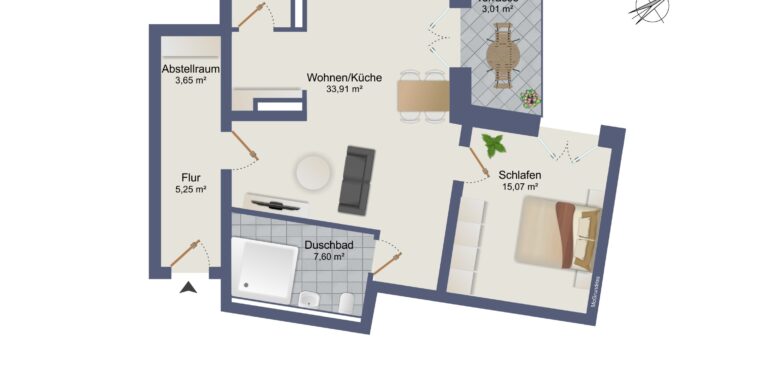 Die Wohnung überzeugt insbesondere durch ihren großzügigen, offen gestalteten Wohn-, Ess- und Küchenbereich, der das Herzstück des Grundrisses bildet. Große Fensterflächen schaffen ein lichtdurchflutetes Ambiente und verbinden den Innenraum harmonisch mit der angrenzenden Terrasse – ein idealer Ort für entspannte Stunden im Freien.