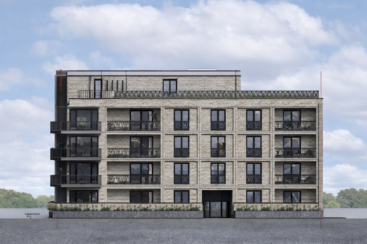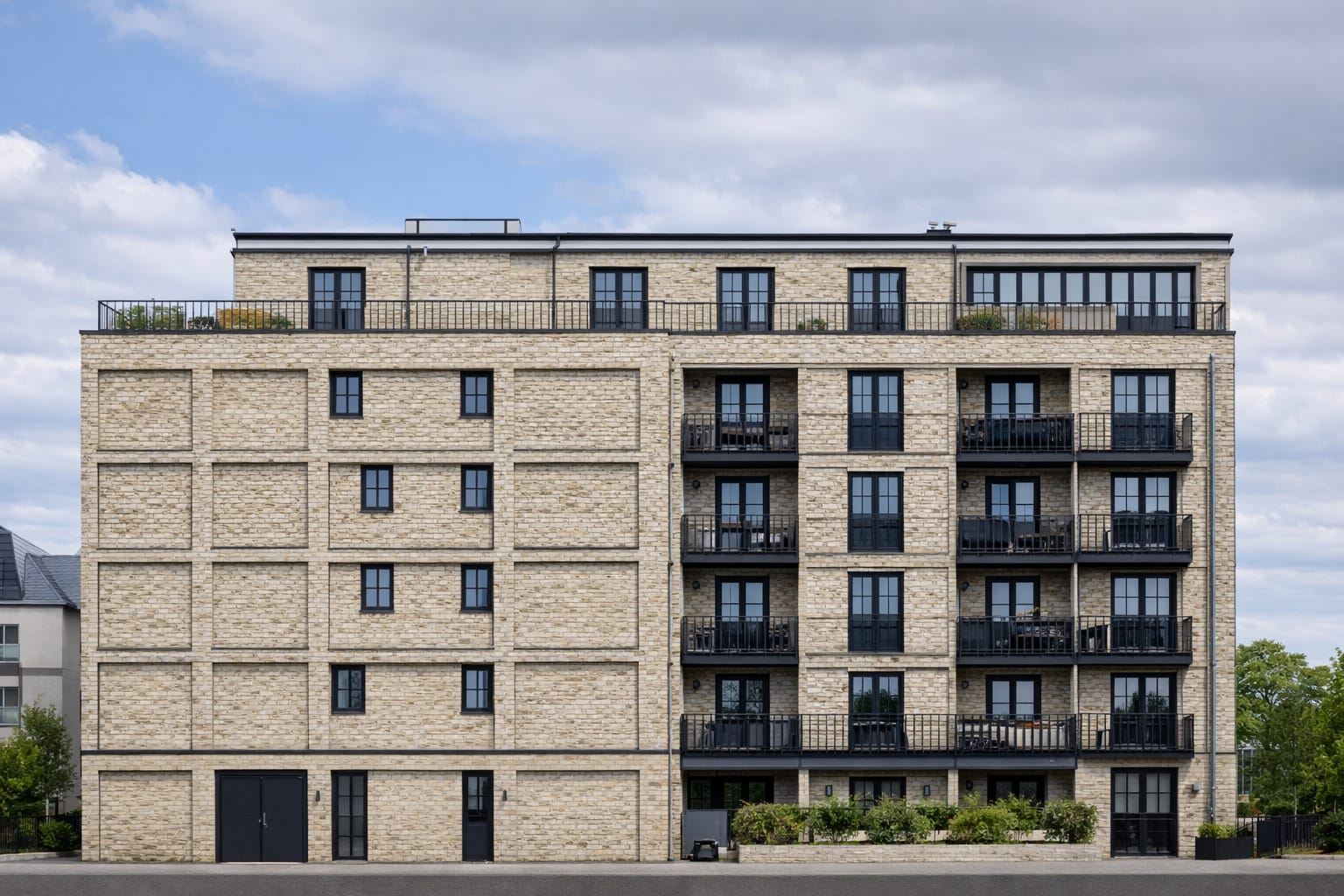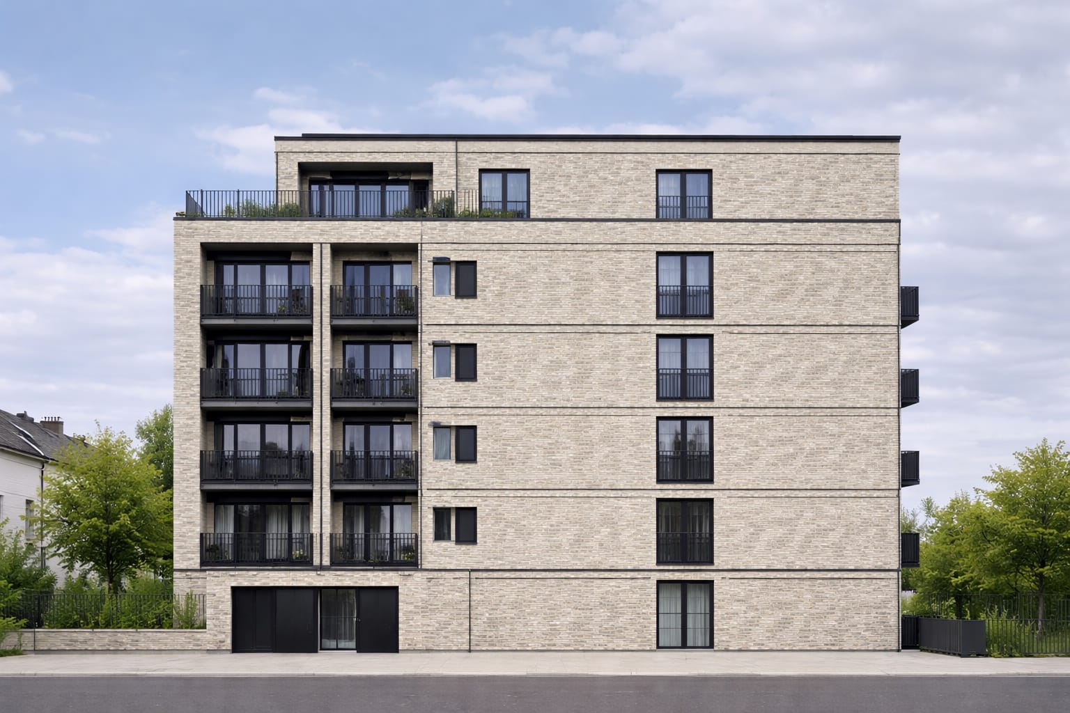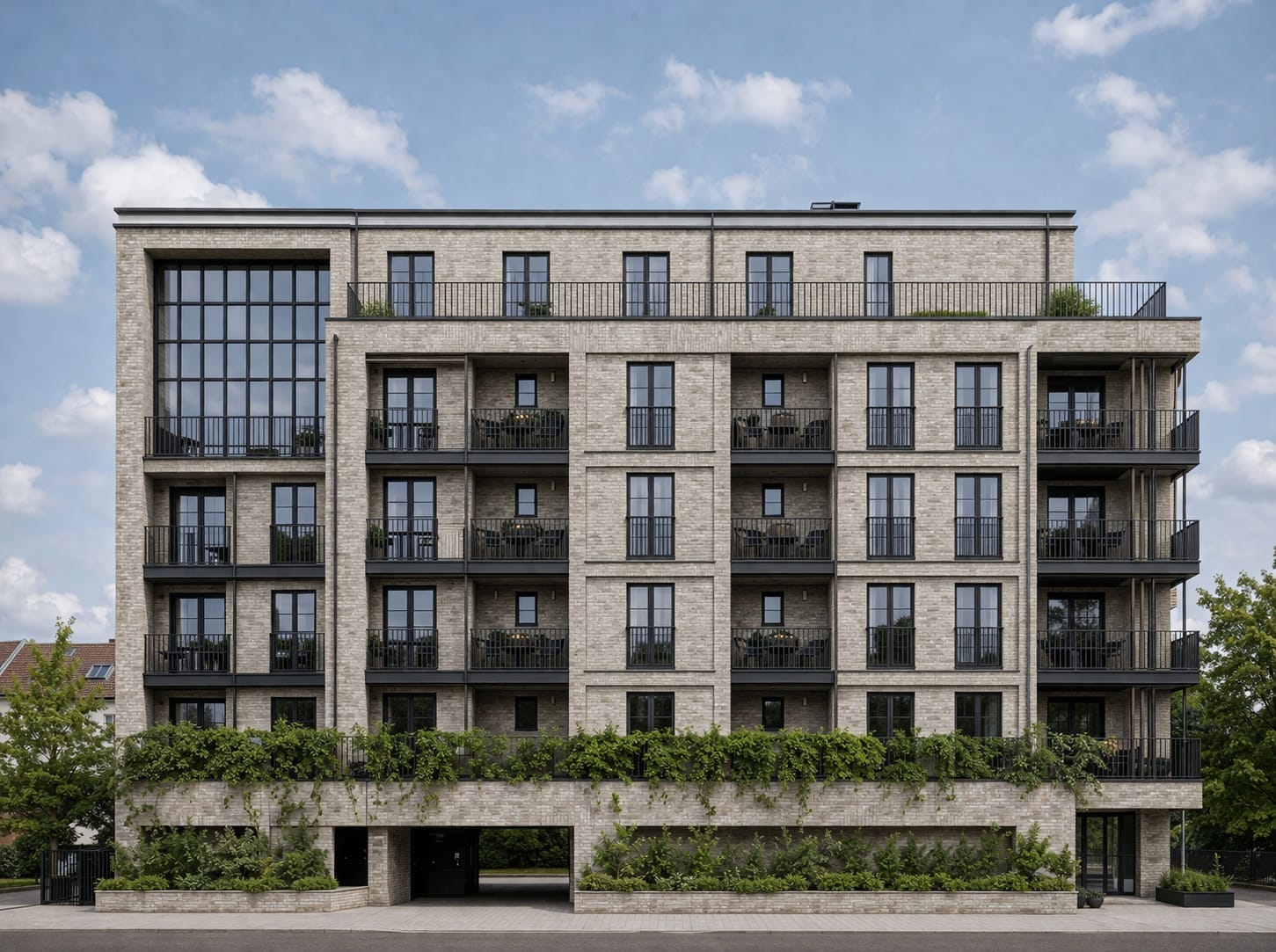 Das Mehrfamilienhaus besticht durch seine klare, zeitlose Architektur mit hochwertiger Klinkerfassade und stilvollen Balkonen. Die gelungene Verbindung aus urbanem Design und begrünten Elementen schafft ein modernes, zugleich wohnliches Erscheinungsbild.