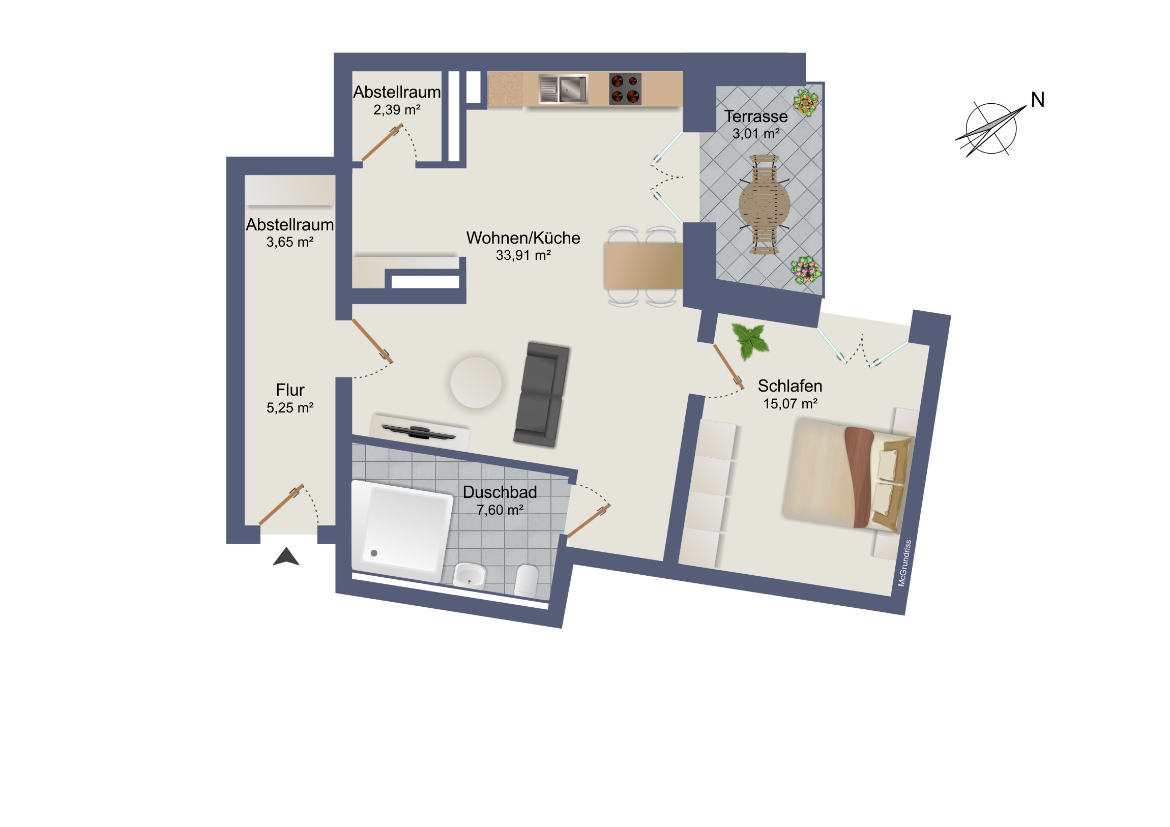Die Wohnung überzeugt insbesondere durch ihren großzügigen, offen gestalteten Wohn-, Ess- und Küchenbereich, der das Herzstück des Grundrisses bildet. Große Fensterflächen schaffen ein lichtdurchflutetes Ambiente und verbinden den Innenraum harmonisch mit der angrenzenden Terrasse – ein idealer Ort für entspannte Stunden im Freien.